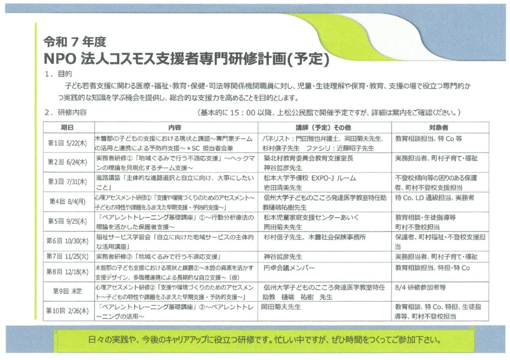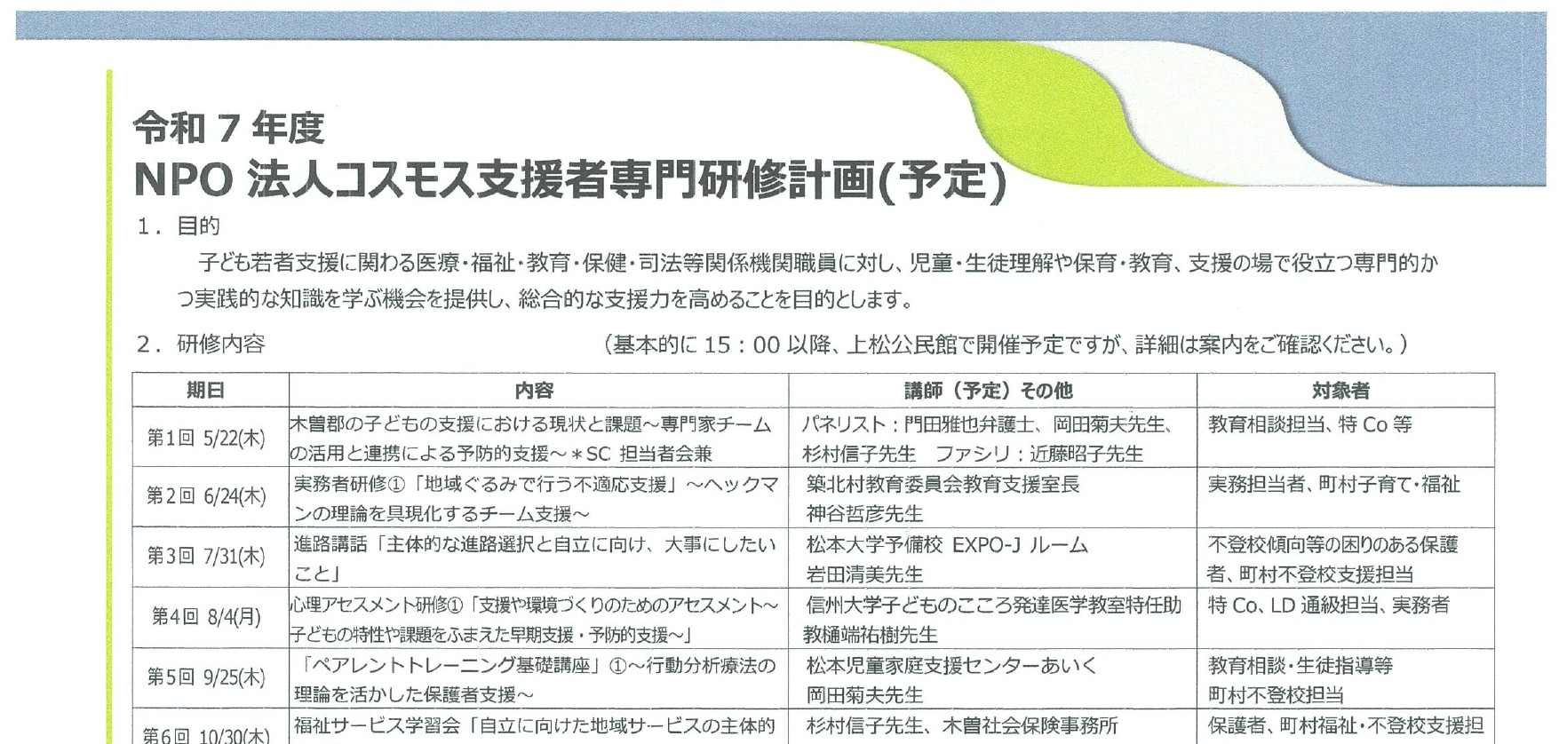 | 10月30日(木) | 福祉サービス学習会「自立に向けた地域サービスの主体的な活用講座」 | 杉村信子先生、 木曽社会保険事務所 | 保護者、町村福祉・不登校支援担当 |