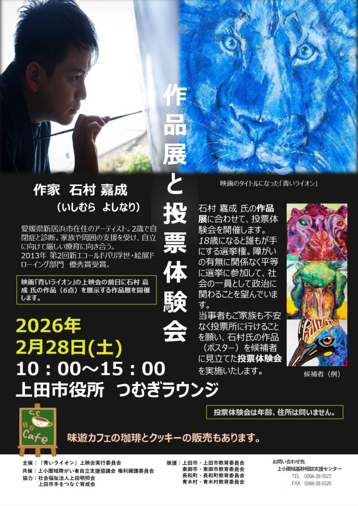 当事者もご家族も不安なく投票所に行けることを願い、石村氏の作品(ポスター)を候補者に見立てた投票体験会を実施いたします。