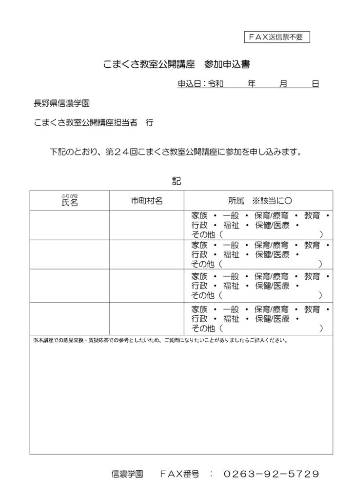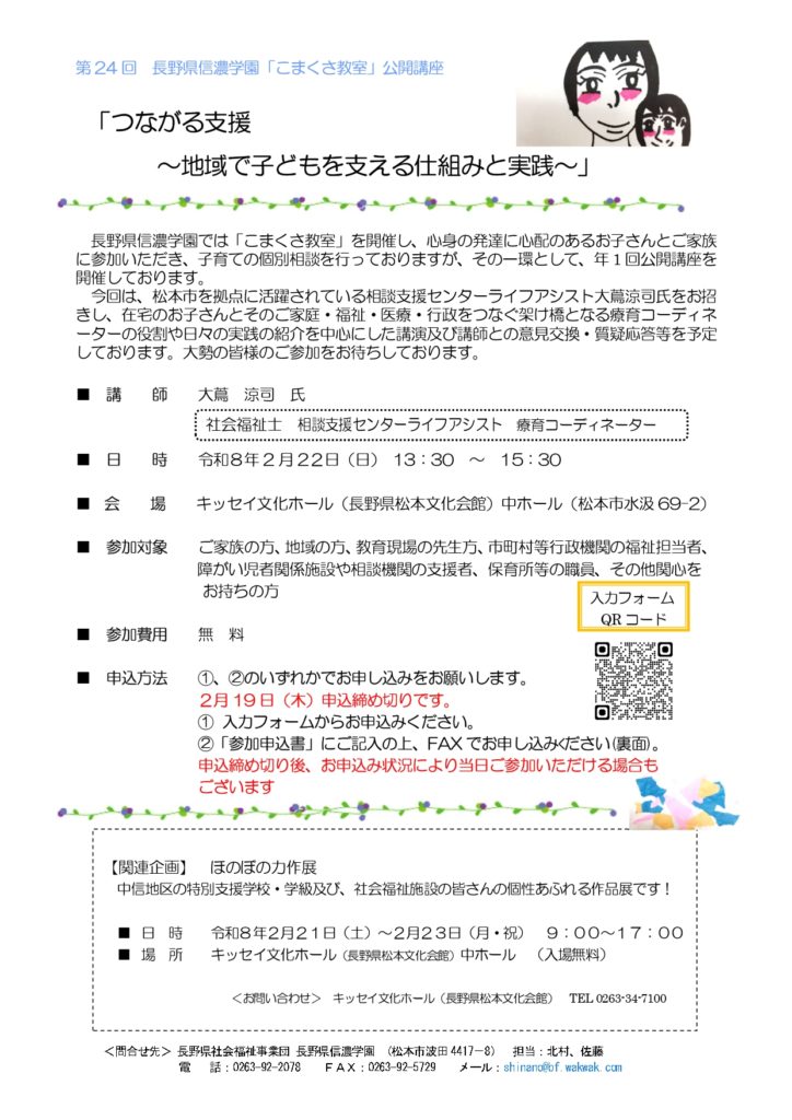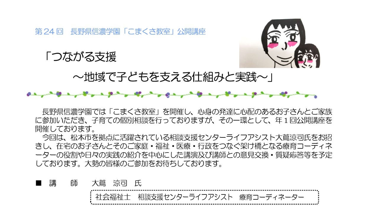 長野県信濃学園では「こまくさ教室」を開催し、心身の発達に心配のあるお子さんとご家族に参加いただき、子育ての個別相談を行っておりますが、その一環として、年1回公開講座を開催しております。