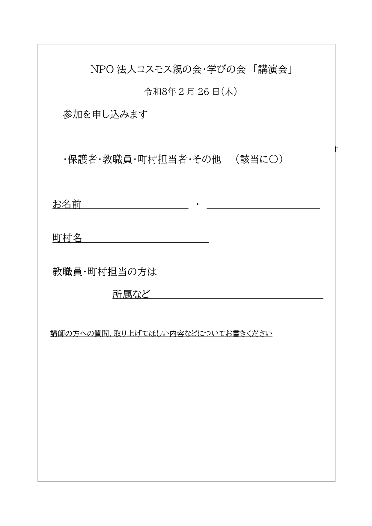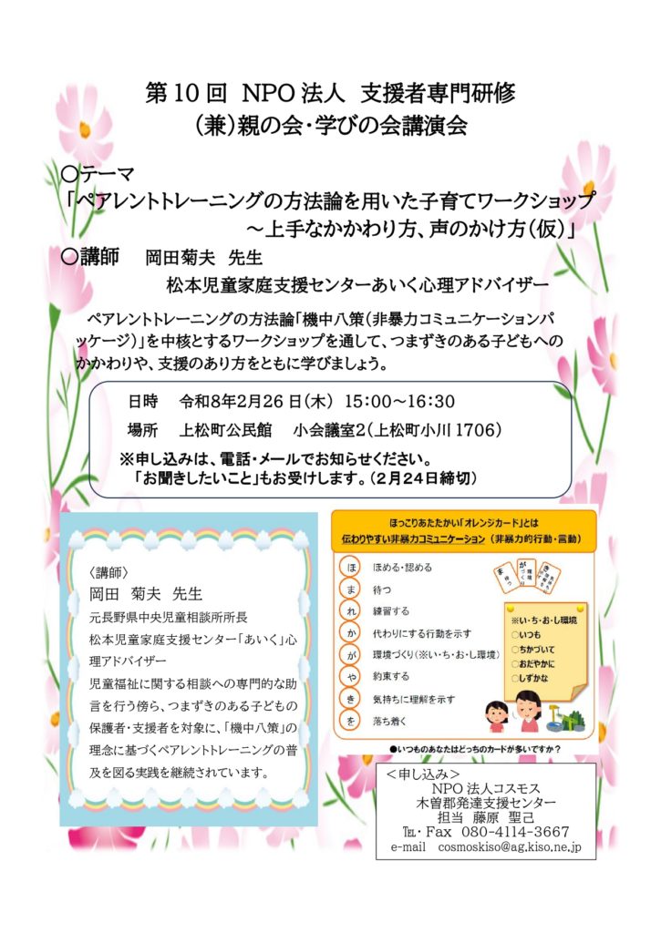 お問い合わせ(事務局):NPO法人コスモス・木曽郡発達支援センター(担当藤原)