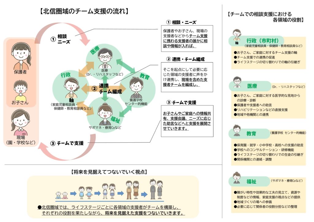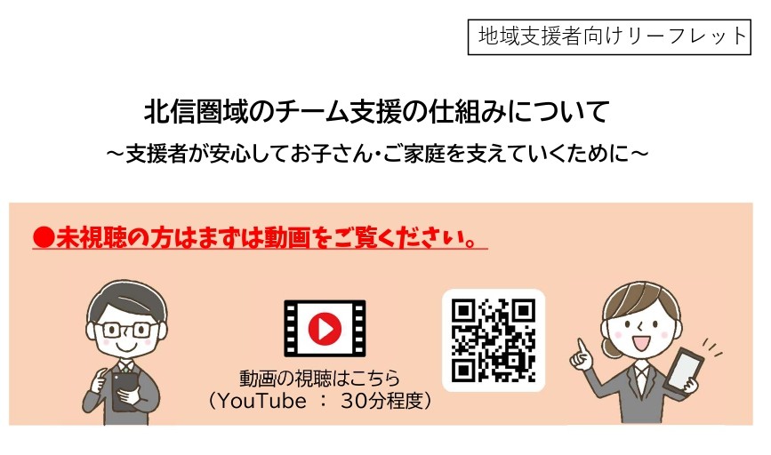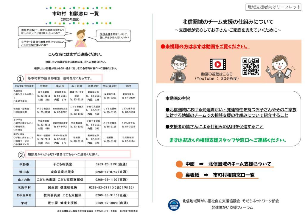 北信圏域の自立支援協議会で作成した、市町村の相談先とチーム支援の仕組みについての動画QRコードが掲載されたリーフレットです。