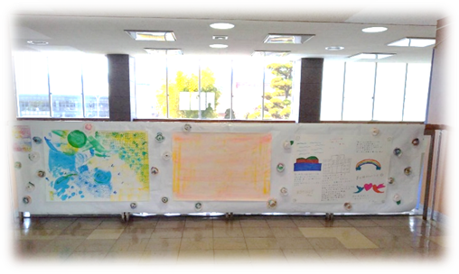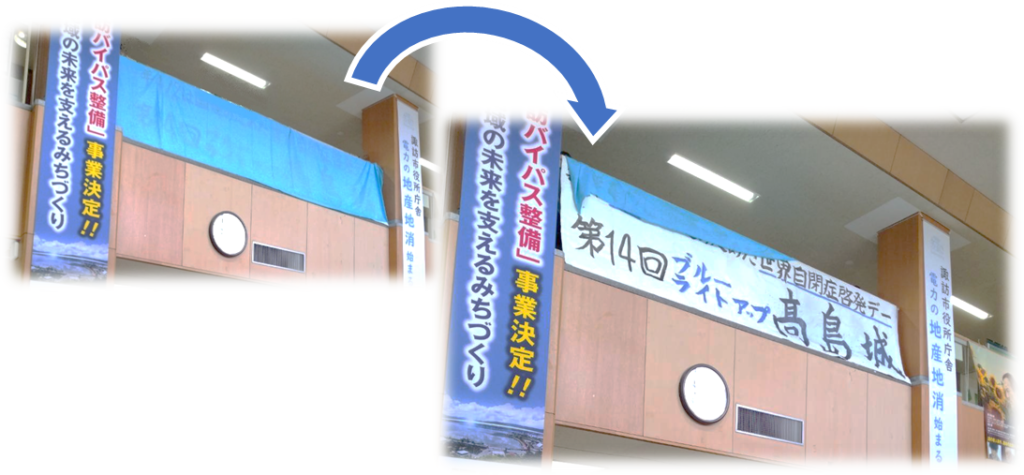 トピック「世界自閉症啓発デー」にあわせて、3月27日(金)に諏訪市役所にて第14回ブルーライトアップ高島城の除幕式が行われました。吹き抜けに諏訪清陵高校書道部の皆さんが書いた横断幕が飾られ、裏側にはクリエイターチーム「アーツ・ユニバース」の作品が展示されました。