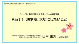 動画ライブラリー 発達が気になる子どもへの早期支援シリーズ 信州大学医学部子どものこころの発達医学教室招待教授・相模女子大学人間社会学部教授の日戸由刈先生(公認心理師)による講座になります。 2026.03.05 動画ライブラリー